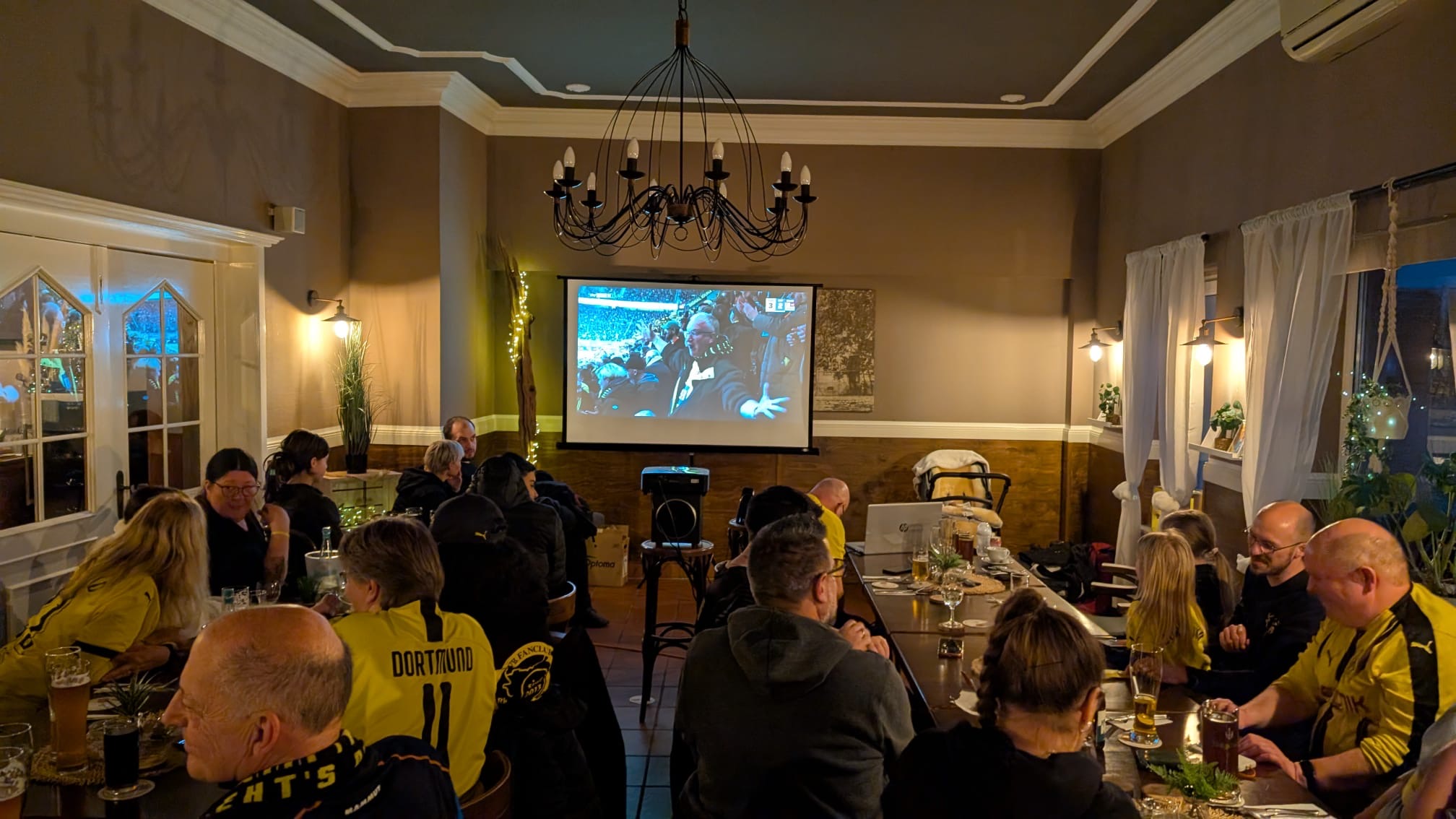 Dort angekommen war die Gruppe nun komplett – insgesamt hatten sich 33 Mitglieder versammelt! Pünktlich um 15:30 Uhr hatte jeder seinen Platz eingenommen, sodass wir gemeinsam den Rückrundenauftakt gegen St. Pauli auf der Leinwand verfolgen konnten.